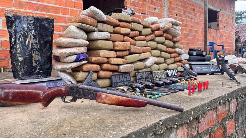 No local, também foram apreendidas armas de fogo de grosso calibre, incluindo pistolas, além de equipamentos utilizados no monitoramento da área.