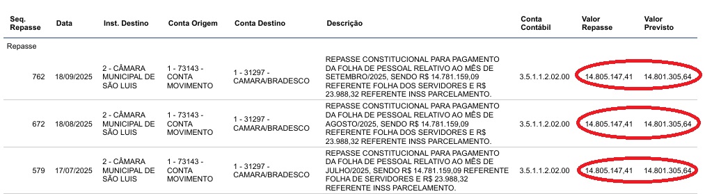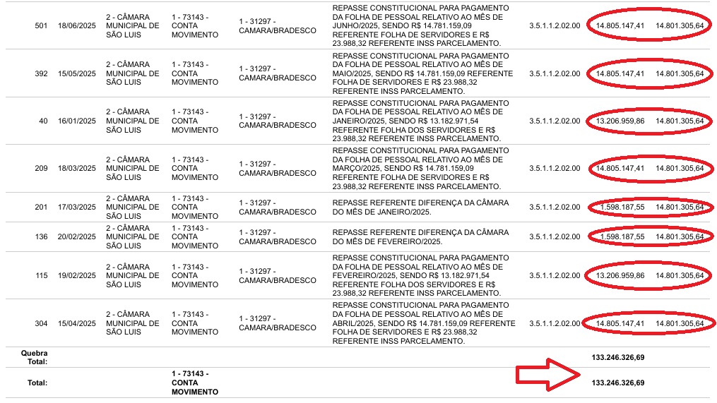 Um cenário de total descontrole financeiro, desvios de função, nepotismo e total descompasso com a realidade da população marca a gestão da Câmara Municipal de São Luís. Enquanto a cidade enfrenta problemas crônicos na saúde, educação e infraestrutura, o legislativo municipal já estourou em apenas 9 (nove) meses, o total de R$ 133.246.326,69 (Cento e Trinta e Três Milhões, Duzentos e Quarenta e Seis Mil, Trezentos e Vinte e Seis Reais), valor que não se reflete em fiscalização efetiva ou qualidade legislativa, mas sim em uma máquina inchada e opaca. Esta reportagem investigativa do Site Observatório é resultado de um mês de apuração, com base em dezenas de documentos internos, portarias sigilosas e depoimentos de servidores que preferiram manter o anonimato por temer represálias. Veja abaixo, os repasses realizados para conta da Câmara Municipal de São Luís.
